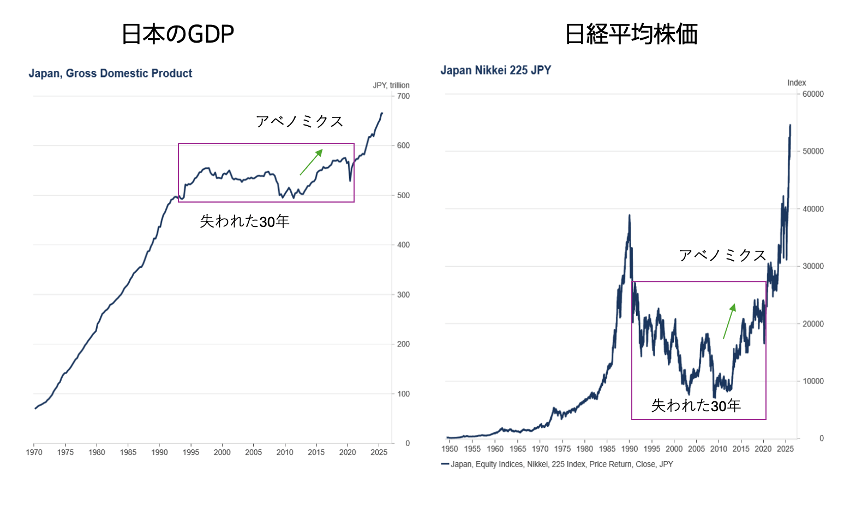 下のグラフに示す日本のGDPと日経平均株価の推移を見ると、1990年バブル崩壊から「デフレ不況」が進行し、第2次安倍政権(2012-20年)のアベノミクス「3本の矢」(異次元の超金融緩和、財政出動、成長戦略)をもってやっと脱出できたのが2020年です。約30年近くも経済的停滞が続いたことが見てとれます。
